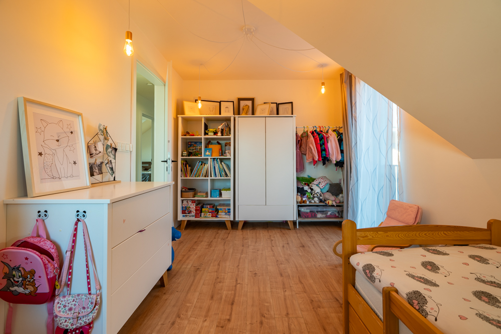 Po schodišti se dostanete do prvního patra (na schodiště je potřeba instalovat finální nášlapnou vrstvu), kde se nachází prostorný a světlý dětský pokoj situovaný na jih dále ložnice s dostatkem prostoru pro manželskou postel a úložné skříně. Dalším pokojem v patře je malá pracovna, a ještě jedna velká místnost sloužící v současnosti také jako pracovna. Lze ji přeměnit na druhý dětský pokoj, nebo pokoj pro hosty. Pro pohodlí je zde také připravena instalace pro druhou koupelnu, která nebyla dokončena a nabízí se tak možnost dokončení podle vašich představ.